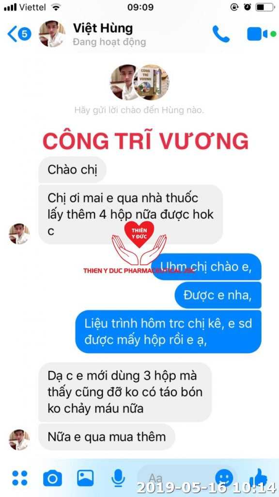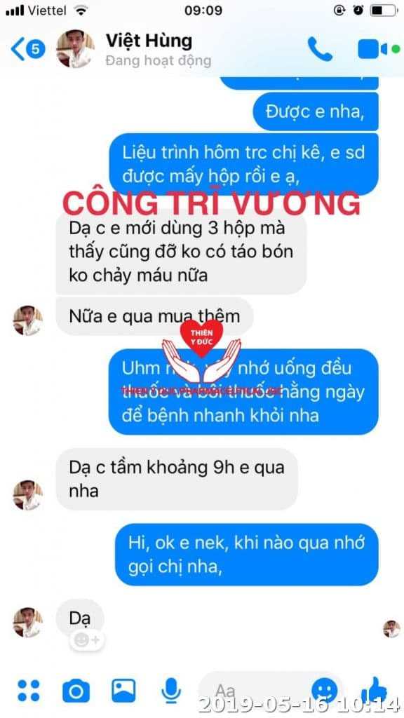 Hùng đã sử dụng thuốc tây nhưng dùng thì đỡ, ngưng thì lại đau buốt trở lại. Tìm được page Công Trĩ Vương. Hùng mới sử dụng được 3 hộp bên nhà thuốc thấy ngưng chảy máu và táo bón cũng không còn nữa.
