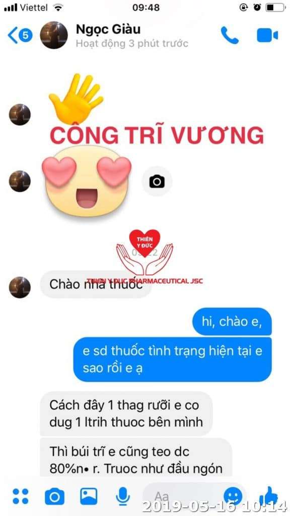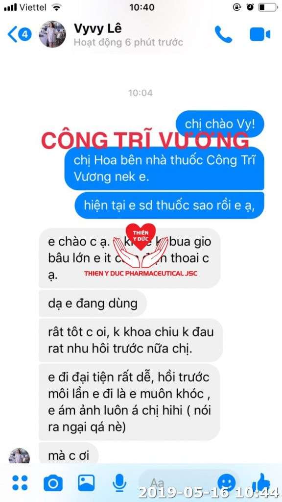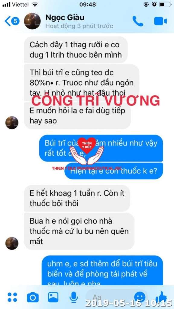 Em đã thử rất nhiều thuốc từ Tây Y đến Đông y và cả lấy lá diếp nhưng chỉ giảm được triệu chứng đau rát, còn búi trĩ thì vẫn giữ nguyên, được một chị cùng công ty giới thiệu về CÔNG TRĨ VƯƠNG em bắt đầu sử dụng liệu trình đầu tiên thì búi trĩ em cũng teo được 80%.