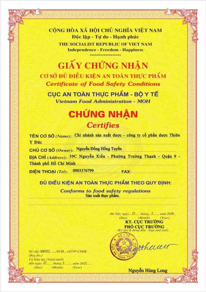 Nhà máy sx cty CP Dược Thiên Y Đức ĐẠT CHUẨN BỘ Y TẾ CẤP PHÉP